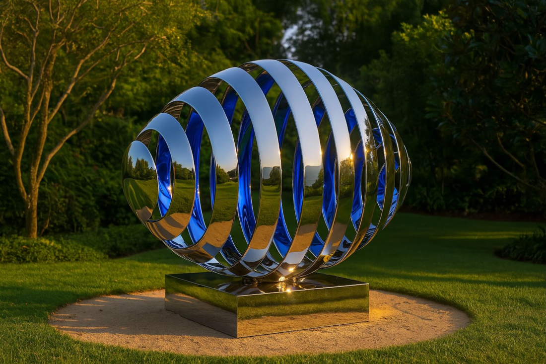 Silver Bib1 de George Panossian est une sculpture contemporaine en acier inoxydable poli, composée de rubans métalliques torsadés formant un volume organique et aérien. Son effet miroir capte l’environnement, créant un jeu d’illusions optiques et de reflets changeants.